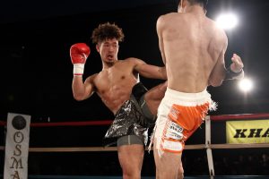 2R、椿原は左右のローも増やし、顔面とボディへのパンチも当て、軽快に攻め続ける。森坂も右ローを当て、椿原の腿は赤くなるが、森坂のほうがバランスが悪くなってきた。記者採点は9-10で椿原。