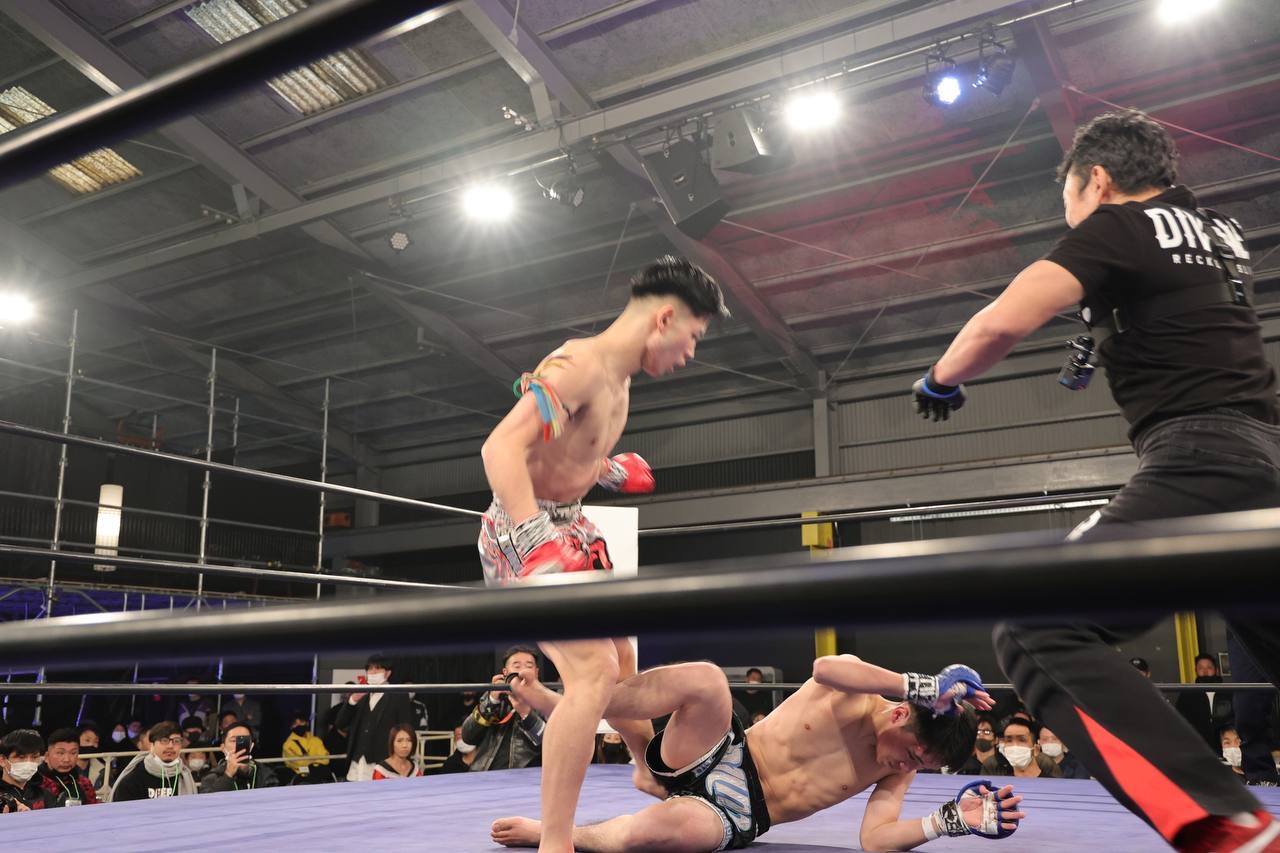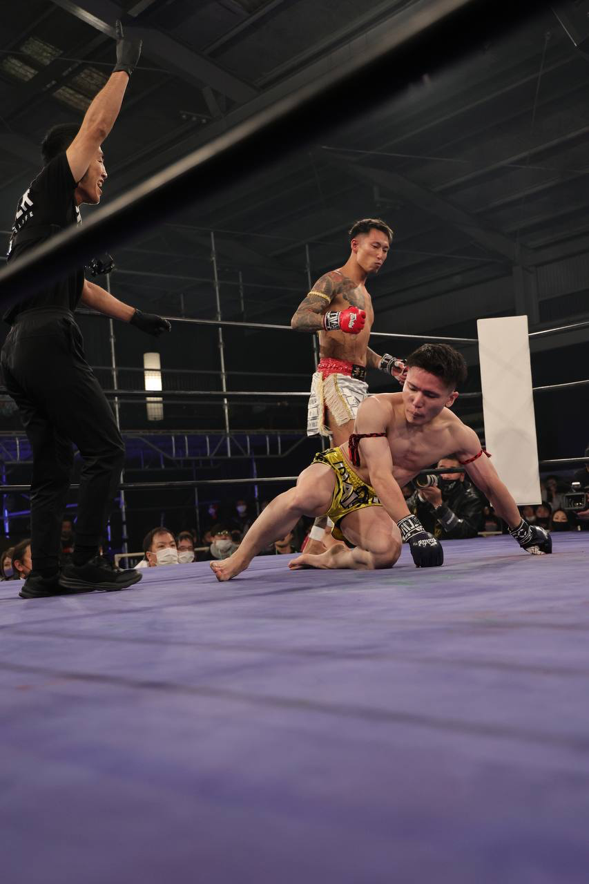 立てないかと思われたが、なんとか立ち上がり反撃するも、足元がふらついたところにローをもらって、倒れたのをダウンとされ3ノックダウン。