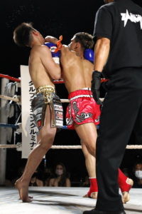 2ラウンド、ベテランらしく隙のないスダは、組まれても負けず反撃の隙を窺っている。突如として左回転ヒジ打ちを高速であわせるスダ。時折返す右パンチがやはり重い。