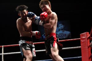 21歳の良星と19歳の祐の若手対決。1R、サウスポーで長身の祐は左ミドル主体で攻めようとするが、良星が物おじせず前に詰めて、右ミドル、ハイ、右フック、バックハンドブロー等で積極的に攻め、やや優勢だ。
