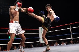 2R、序盤からMASATOが右フックを炸裂させると、ローのヒットも増やし、少しずつ優勢に。3RもMASATOが圧力をかけ続け、右ローを効かせつつ、バックハンドブローや上段回転蹴りを放って攻勢を印象付け判定勝ちした。