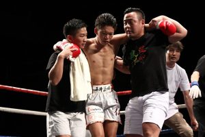 3R、恭士郎は逆転を狙い執拗に前に出て、右フック、左ハイを当てるが、変わらず単発止まり。稲石は回ってかわしながら随所でバックスピン等を当て続け、反撃を封じ試合終了。稲石が判定勝ちした。