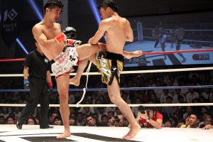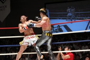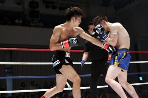 1R、瑛作はサウスポーに構えて圧力をかけ、左ローを積極的にヒットし、左ストレート、右肘等も当てる。塁もパンチとローと肘を返し、瑛作に鼻血を出させるが、後手に回り、瑛作が自分の距離を作り続ける展開。記者とジャッジ1名が瑛作につける。ジャッジ2名はイーブンだ。