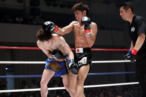 1R、サウスポーの鈴木に対し、不可思が回って距離を取りながら、右ミドル、ローを積極的にヒット。鈴木も左のインロー主体で応戦するが、蹴り数で劣る。ジャッジ2名と記者はイーブン。1名は不可思につける。
