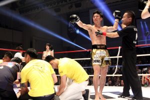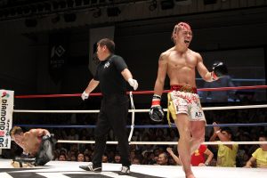3Rも瑛作が左ミドル、ローを当てて主導権。とはいえ塁も距離を詰めて顔面とボディにパンチをまとめる場面もあり、まだわからない状態だ。瑛作が左ミドルを連打し、塁は笑顔を浮かべ後退。効いているようにも見えたが、瑛作が右フックを振るいながら前に詰めて来ると、塁はカウンターの右ストレートをクリーンヒット。瑛作は大の字で倒れ、明らかに立てない状態だが、小川レフェリーは10カウントまで数え切り、塁のKO勝ちに。衝撃の大逆転劇に、後楽園ホールは割れんばかりの大歓声に包まれた。