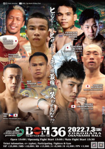 この試合は4月24日のBOM大分大会で組まれていたが、ペットニポンが空港での新型コロナウイルスの検査で陽性と判明したため中止となっていた。吉成は同大会で内藤啓人と対戦し2R TKO勝ちしている。ペットニポンは戦績75戦60勝13敗2分。今回はペットニポンが持つタイ国プロムエタイ協会フライ級王座の防衛戦と、石井一成が返上したWPMF世界フライ級王座の決定戦が兼ねて行われる。なお、リングサイド席では魔裟斗氏も試合を見守り、中継の解説席には石井、梅野源治も座る。