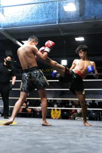 1R、積極的に上下に散らす攻撃の柿はボディ連打、右ハイ。柊真は前に出てバックスピン。柊真のプレスの前に、柿は下がりながらもワンツー。手数の増える柊真に、柿も応戦し互角の戦い。