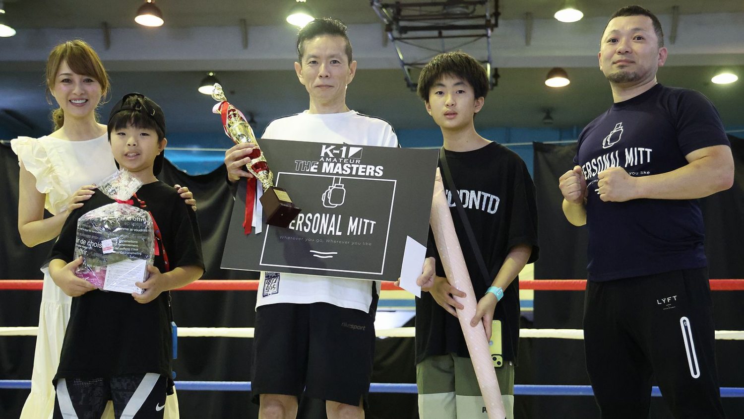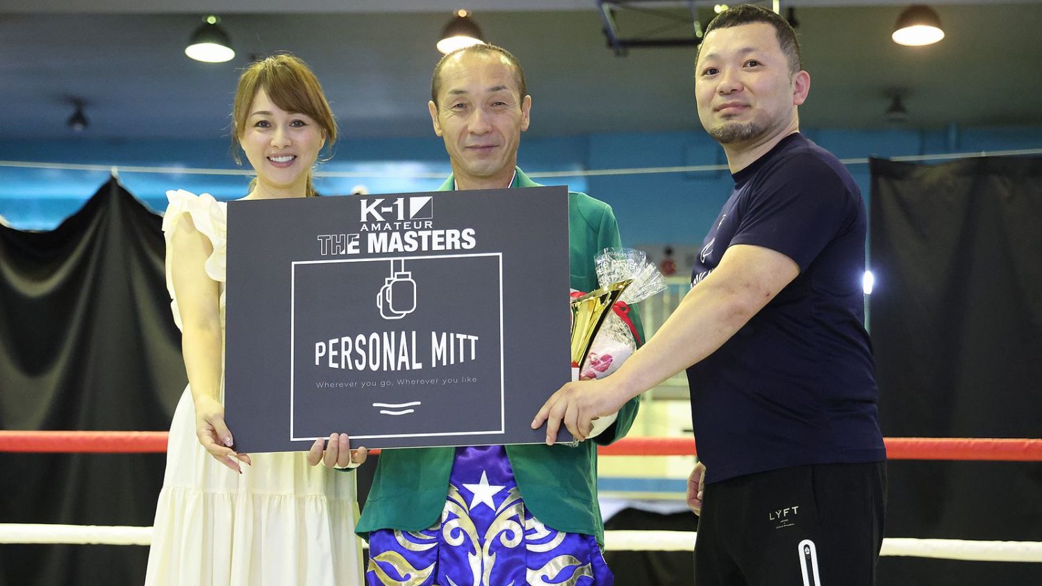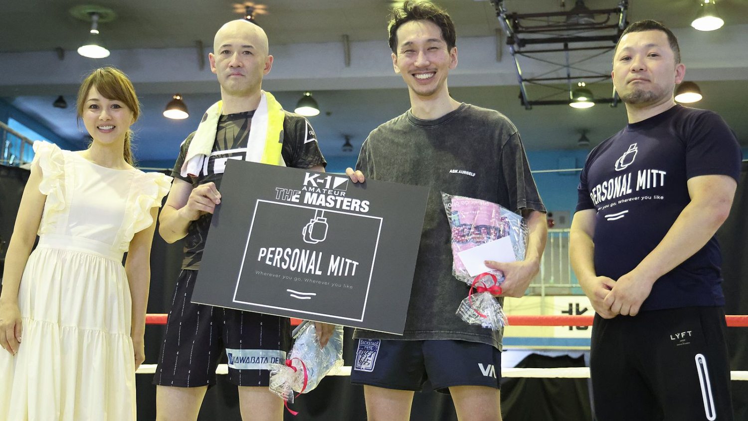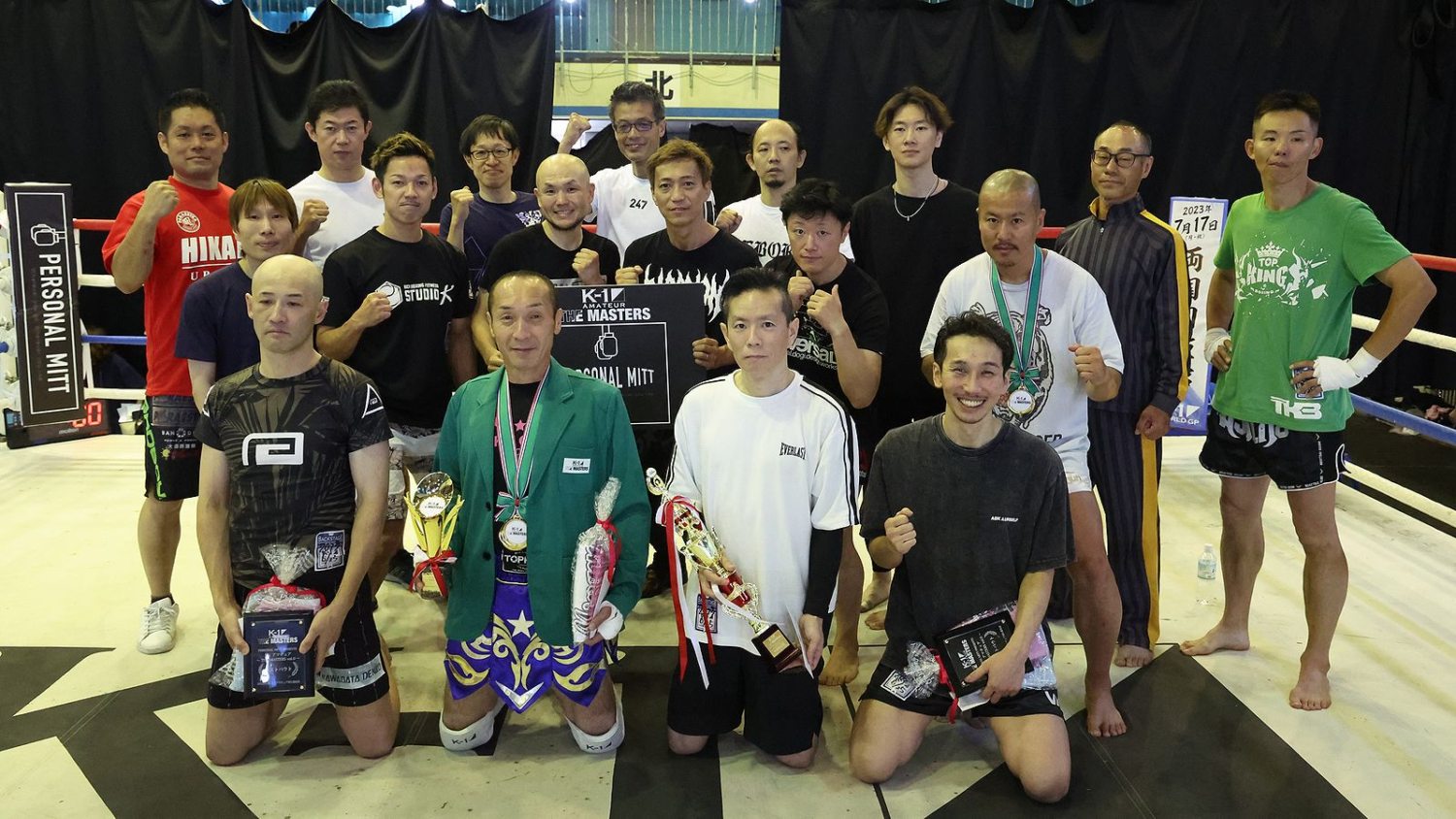 最後に中村拓己K-1プロデューサーが「K-1アマチュアを開催するなかで、たくさんの40歳以上の選手が出てくれていて、そういった選手にスポットライトが当たる場所を作りたいと思い、今年から40歳以上限定の大会をスタートすることになりました。このコンセプトに賛同いただき、PERSONAL MITTさまに冠協賛いただいたことをうれしく思っています。K-1はプロイベントが一番注目されていますが、僕は年齢性別問わず、誰でも取り組んでもらえるものがK-1というスポーツだと思います。見てやって楽しんでもらえればと思います」と総括。「1・2・3、マスターズ!」の大合唱で大会を締めくくった。