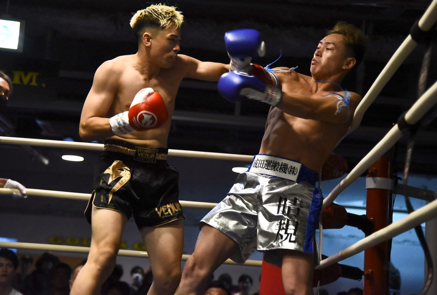 2R、パンチの回転力で上回る簗に、近藤はパンチをもらいながらも近距離でヒザ蹴りを入れて削っていく。ロープ際に追われる近藤は応戦も、簗はパンチ連打。お互いに激しく打撃を交換する展開に場内は沸いた。