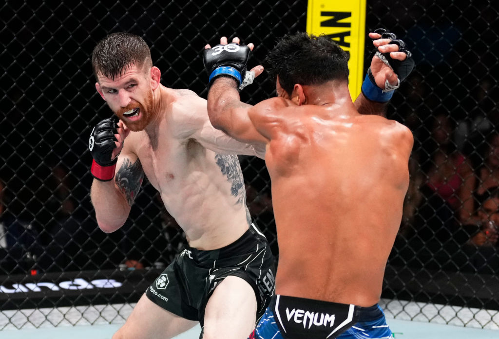 NASHVILLE, TENNESSEE – AUGUST 05: (L-R) Cory Sandhagen punches Rob Font in a 140-pound catchweight fight during the UFC Fight Night event at Bridgestone Arena on August 05, 2023 in Nashville, Tennessee. (Photo by Jeff Bottari/Zuffa LLC via Getty Images)