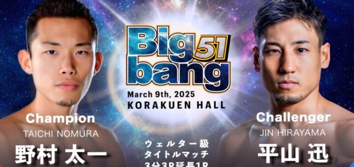 ニュース 2025-01-07 by BOUTREVIEW · Published 2025-01-07 · Last modified 2025-02-27 Bigbang 3.9 後楽園ホール:ウェルター級王者・野村太一、平山迅を相手に初防衛戦。駿太×石川直樹、ベテラン同士の肘有り対決。琢磨×奥平将太、林京平×ポッシブルKも決定