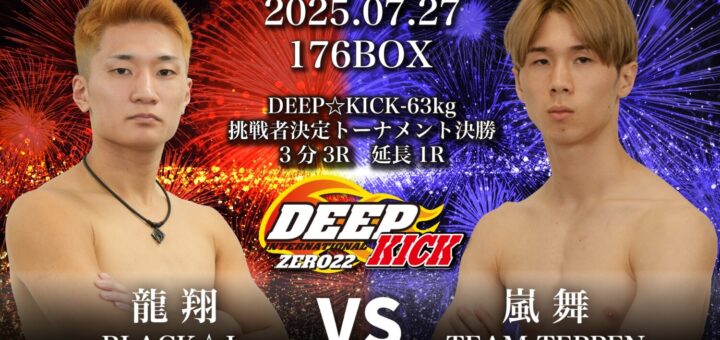 ニュース 2025-06-12 by BOUTREVIEW · Published 2025-06-12 DEEP☆KICK 7.27 大阪 176BOX:龍翔×嵐舞で-63kg王座挑戦者決定戦。松本愛斗×水野夢斗、一樹×龍太郎で-51kg王座決定トーナメント準決勝