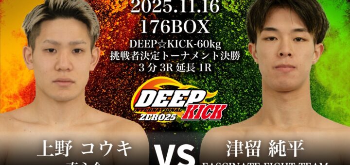 ニュース 2025-09-24 by BOUTREVIEW · Published 2025-09-24 DEEP☆KICK 11.16 大阪 176BOX:上野コウキ×津留純平で-60kg挑戦者決定トーナメント決勝、井上大和×山﨑天輔、虎太朗×田中恒星で-55kg挑戦者決定トーナメント準決勝