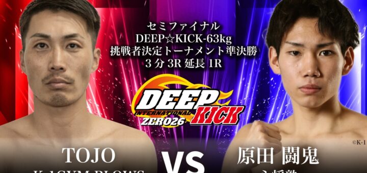 ニュース 2025-12-24 by BOUTREVIEW · Published 2025-12-24 DEEP☆KICK 1.25 大阪 176BOX:現役自衛官 TOJO×原田翔貴 改め 原田闘鬼の-63kg挑戦者決定トーナメント準決勝ほか追加。全カード揃う