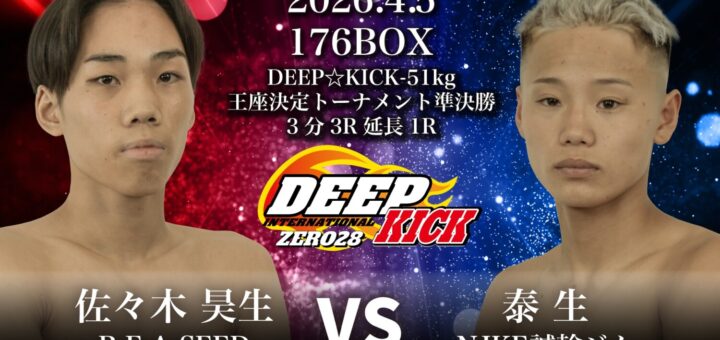 ニュース 2026-01-09 by BOUTREVIEW · Published 2026-01-09 DEEP☆KICK 4.5 大阪 176BOX: -51kg王座決定トーナメント開幕。5戦全勝の佐々木昊生は泰生と初戦。22戦目のベテラン龍太郎は林ジャッカル裕人と