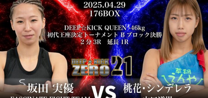 ニュース 2025-03-22 by BOUTREVIEW · Published 2025-03-22 DEEP☆KICK 4.29 大阪 176BOX:百花×花田麻衣、坂田実優×桃花・シンデレラ、女子-46kg初代王座決定戦進出懸け2試合実施
