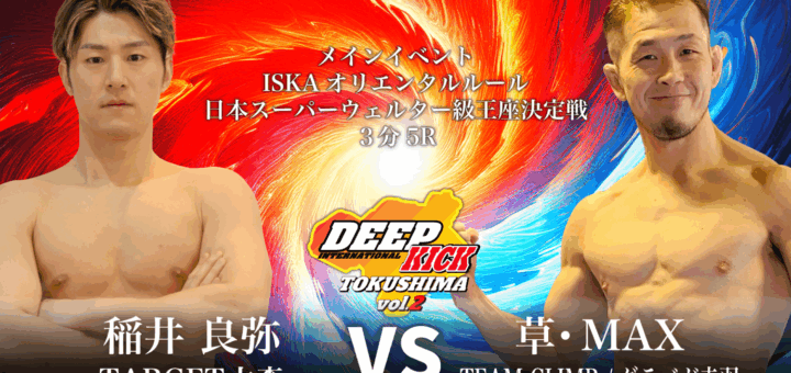 ニュース 2025-04-21 by BOUTREVIEW · Published 2025-04-21 DEEP☆KICK 5.18 徳島県石井町中央公民館:地元出身の稲井良弥、草・MAXとISKAオリエンタルルール日本スーパーウェルター級王座決定戦