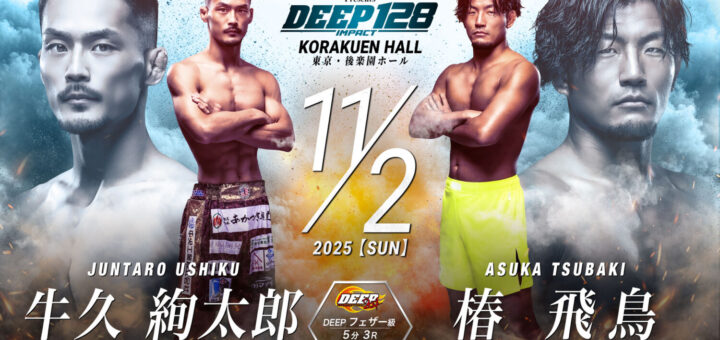 Push / ニュース 2025-09-12 by BOUTREVIEW · Published 2025-09-12 DEEP 11.2 後楽園ホール:牛久絢太郎、フェザー級に戻りDEEP初参戦の椿飛鳥と対戦。大原樹理×神田コウヤでライト級暫定王者決定戦。北岡悟はJTTの山田聖真と対戦。直樹、MMA 3戦目は三井俊希と