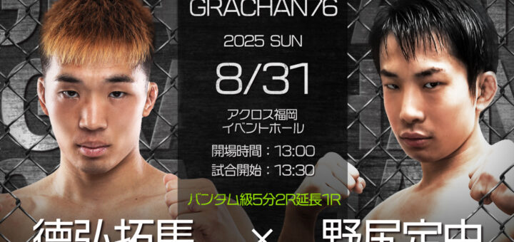 ニュース 2025-08-06 by BOUTREVIEW · Published 2025-08-06 GRACHAN 8.31 アクロス福岡:GRACHAN 徳弘拓馬×修斗 野尻定由 バンタム級ランカー対決。野瀬翔平×石橋佳大のグラップリング戦も