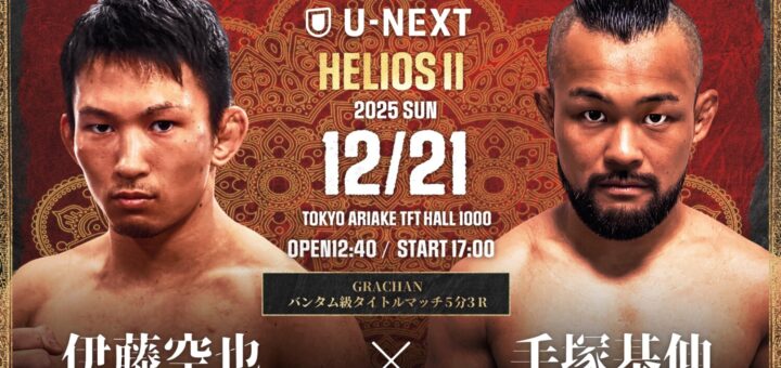 ニュース 2025-12-20 by BOUTREVIEW · Published 2025-12-20 GRACHAN 12.21 TFTホール1000:HELIOS IIをU-NEXTで生中継。バンタム級王者 伊藤空也「4年間の練習の答え合わせを」×挑戦者 手塚基伸「伊藤君が作ってくれたストーリーとベルトで格闘技に戻れた」。ウェルター級王座決定戦 林RICE陽太×山田哲也 談話も
