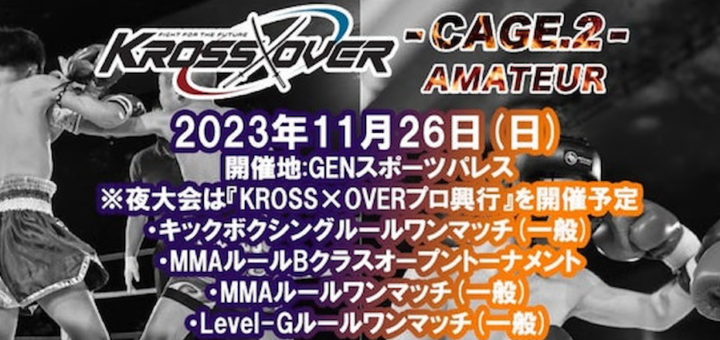 トピックス 2023-10-12 by BOUTREVIEW · Published 2023-10-12 · Last modified 2023-10-20 出場者募集 KROSS×OVER-CAGE.2- アマチュア大会 11.26 東京 GENスポーツパレス/MMA・キック・Level-G(グラップリング)ワンマッチ、MMA Bクラス トーナメント【PR】