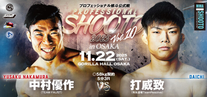 ニュース 2025-10-28 by BOUTREVIEW · Published 2025-10-28 修斗 11.22 ゴリラホール大阪:中村優作が打威致と対戦。新空手提供キック-67.5kgトーナメントも開催
