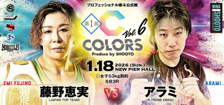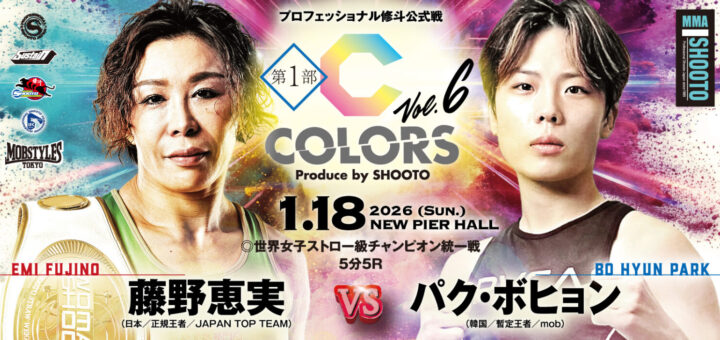 ニュース 2025-12-08 by BOUTREVIEW · Published 2025-12-08 · Last modified 2025-12-11 修斗 COLORS 1.18 ニューピア:藤野恵実×パク・ボヒョンの世界女子ストロー級王座統一戦。Lemino修斗でハイキックKO勝ちの徳本望愛が杉本恵と対戦。高本千代とerikaの女子スーパーアトム級リーグ戦も