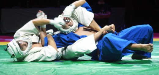 空道(くうどう)は、顔面防具・道着着用のうえで、頭突きや顔面へのヒジ打ちを含む打撃や、道着を掴んでの投げ技、寝た状態での絞め技・関節技により闘う、「空手+柔道」「ジャケットMMA」あるいは「着衣総合格闘技」といったかたちで評される競技。その階級別大会は「身長センチ+体重キロ」の数値によって階級を分ける「体力別選手権」として、開催されます。