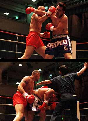 ななんともラフな展開で、セイント選手の力もよくわからなかった。藤本選手の方が準備不足だったのか、力量不足だったのか。試合は一方的にセイント選手が殴りまくるばかりで、およそキックの試合として評価するには大味に過ぎた一戦だった。 両者とも、スピードがあるわけでもなく足を止めての撃ち合いかと思ったが、撃ち合いになる前に試合が決まってしまった。時折、ミドルやローを交えたり首をつかみにいったセイント選手がキックの動きをしていたのは分かるが、対する藤本選手が、構えも動きもキックの選手らしいところをほとんど見せることがなかったので、セイント選手のキックボクサーとしての評価は次の試合以降に持ち越された。 連盟はヘビー級にも力を入れていくようなので、今後の展開に期待したいと思う。 文 片岡