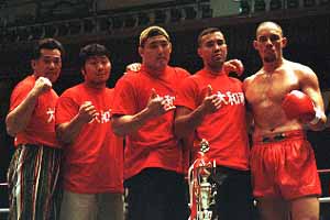 会場の観客席を見回すと、エンセン井上選手、朝日昇選手、池田久雄選手…修斗の選手が座っている。隣にはリングスに参戦中の金原選手、大相撲の武蔵丸関もいる。キックの会場にあって、一種異様な集団は、皆、この試合に登場するセイント選手の応援団&セコンドであった。 セイント選手の所属は、修斗大宮(STG大宮)。総合系の大会にも参戦している異色の選手であるが、キックのキャリアも3戦あり(2勝1分)、現在も修行中という。同じくSTG大宮所属の修斗ヘビー級王者エンセン選手が、打撃の修行のために渡辺ジムに出稽古に出かけていた縁もあって、今回試合が組まれた。 一方の藤本選手については、何ら情報がない。今回の試合も、当初のアキラ選手から急遽変更ということで、まさに未知数。 ヘビー級だけに迫力ある撃ち合いは必至。セイント選手が、豪華な応援団に負けないファイトを見せることができるか楽しみだ。