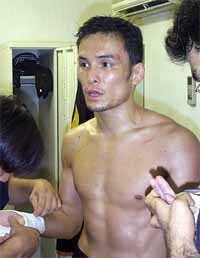 | 伊藤: | 蹴りも強くなかったし、唯一ヤバイのはパンチだけで。(ここで同じ控え室にいたラビット関に)お疲れさん、凄い試合だったらしいね、すいません。申訳ないです。