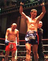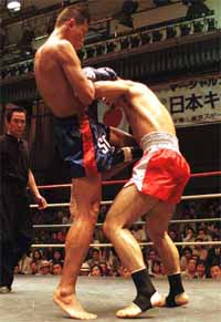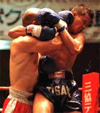 やはりシティサック選手の壁は厚く、なかなか得意のパンチラッシュに持ち込めなかった佐藤選手。クラスアップ第1戦目は、苦いドローに終わってしまった。佐藤選手を評価するとすれば、絶妙な距離感を持つシティサック選手の巧妙にして破壊力十分なテンカオにためらうことなく前進を続けた点だろうか。 しかし、首相撲では全くいいところなくヒザをもらい続け、時折飛んでくるハイキックや高いヒザ蹴りにあわやという場面も少なくなかった。王者としては、いささか安定感に掛けた試合となったことは否めない。結果としてポイント差は少なかったが、首相撲の評価によっては、よもやの大敗ということにもなっただろう。 ここ数戦、不本意な闘いの続いている佐藤選手だが、階級転向を機に、また今日の対戦を糧にさらなるバージョンアップを図ってくることだろう。 なお、この試合前にジョー山中氏の歌の披露があった。歌はいい歌であるし、山中氏の歌唱力は素晴らしい。しかし、既に選手がリングに上がって臨戦態勢に入ったあとに延々フルコーラス歌っては、その間待たされる選手の体は冷えるし(会場はエアコンがかなり効いていた)、士気にも影響を及ぼしかねないのではないか。選手も了承していたのだろうが、了承を求める以前に、このような進行の是非を考え直すべきではなかったか。入場テーマも両者の曲をかけ違えるなど、不手際もあった。もう少し、選手を大事にした運営をして欲しいと思う。 文 片岡