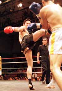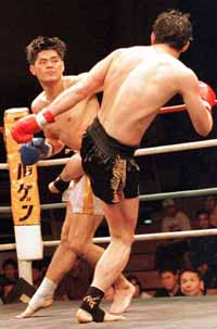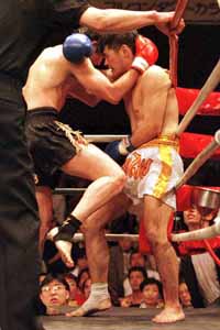左右のパンチで前へ出る緒方、伊藤はミドルを返し距離を詰めて首相撲。離れると得意の左ミドル、又距離を詰めて首相撲に入り膝。後半伊藤は左のローを多用し、これが良く入る。緒方は蹴られると後退。