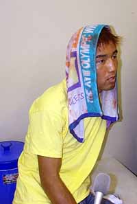 | Q : | 左足は怪我されたんですか(控え室に入ってくる時、新田選手が少し足を引きずっていた)?。 |