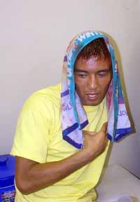 | Q : | タイへ行かれて日本での試合は大分間が空いちゃった感じですが、こないだも相手来なくて(3月に予定されていたヤーシン選手が怪我のためキャンセルした)。どうでした、日本での試合?。 |