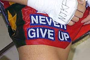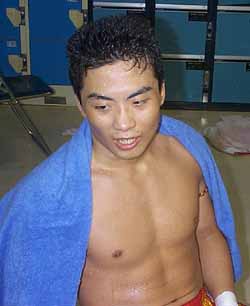 | 青葉: | 疲れ、疲れはもうありありと判ったんです。まあスタミナは無いのは判ってたんで、はい。まあ見ての通り1、2R、まあ作戦て言うか組立としては1、2Rは攻めさせてムエタイのパワー、蹴り、パンチ、肘、どんなもんかちょっと味わってみようって位の感じで。多分3、4Rになると落ちてくるってのはもう判ってたんで。そこでもうガンガン出てって勝負掛けるような感じ・・・でいたんですけど、3Rあの通りで向うの膝効きましたからね、あれでああ言う風になっちゃって。自分の中で、「ああ俺はもう、やっぱこないだのアキレス腱切った時点で選手としては終っていたのかな」と言うような、のが一寸顔を出してしまったんですね。 で、もう何か最後、例えこれでもう終ったって後悔しないような闘いしようって言う感じで4R最後の力出して行こうとしたら、向こうがもう露骨に疲れてるのが判ったんで、はい。ちくしょうって、肘一発でもパンチ一発でもいいから、最後の一発でも諦めないぞっつう。一応今回のテーマがネバーギブアップだったんですけど、まあ諦めないって言う。それで、あれですね、運よく切れた。