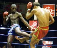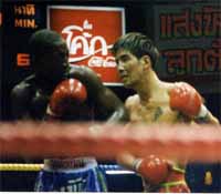 NJKFタイ遠征その1プロローグ「試合前」 控え室を覗くと意外にリラックスした笑顔も見せる新田選手。後ろには対戦相手とおぼしき黒人選手がいます。アフリカ系フランス人とのこと。 リングの各コーナーの後ろ側にセコンドが隔離?される鉄柵があるのですが、自分の試合の一つ前になるとそこに待機します。今新田選手とその柵に入っているのは、シンサック会長をはじめとするSVGの面々、センティアンノーイー、チャモアペット、ジョン・ウェイン、チャーン等日本でもお馴染みの人達です。いやぁ豪華だ。