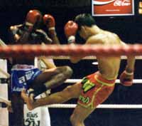 ワイクーもそつなくこなしてゴングが鳴りました。新田選手はやはりと言うべきか、右ローキックから攻めていきます。意外にも相手は嫌がりきちんとブロックもしていません。しかしチャナチャイ選手(便宜上この様に表記します)も慣れてくるとすね受けをし、逆にワンツーパンチで押し込みます。アグレッシブな新田選手が若干目立ちましたが、採点に差はないでしょう。