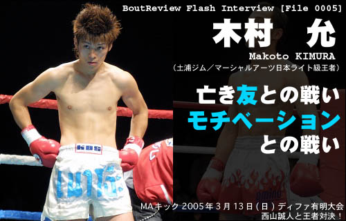 ーー3/13 MAキック後楽園大会での、J-NETWORK西山誠人選手とのライト級王者対決が決まりました。 木村「(土浦ジムの)山本会長に西山戦と言うわけじゃなく、強い選手と例えばタイ人とか色々やらせてくれって話していたら、そんな中決まりました。西山選手も実際強いんで…(しばし沈黙)嬉しいって言ったら嬉しいですけどね」