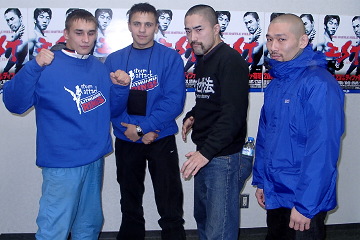 ▼ (11/22 up) いよいよ明日に迫ったZST(ゼスト)の計量と記者会見が新宿のZST事務局で行なわれた(オーストラリアのサム・ネストのみ欠席)。 小谷直之は「リングスの時は主に第1、2試合だったが、今回はメインを任されたので、メインらしい試合をしたい」と意気込みを語った。世界サンボ選手権01年3位のミンダウガス・ローリネイティスと対戦するが「足関節技に気をつける。サンボに無い技で勝ちたい」と語り、対するローリネイティスも「ビデオを見て小谷は手ごわい相手ということをわかっている。戦術はバッチリさ」と自信を見せた。 セミファイナルでは矢野卓見と今成正和の「チーム・イリホリ」がタッグマッチに挑む。会見では矢野がリングス・リトアニア組を見て「凶悪そう」と挑発。これは矢野流のジョークかと思われるが、矢野の独特のキャラクターを知るはずもないリトアニアのレミギウス・モリカビュチスは「相手を外見で判断するのはどうかと思う」と真面目に反論し、出席者の笑いを誘っていた。試合でもイリホリが変則的な技を多発しそうだが、純朴なリトアニア組がそれにどう対処するかが見物だ。(井原芳徳) (写真:タッグルールに出場する4人。どう見てもイリホリ組の方が凶悪そうなのだが…)