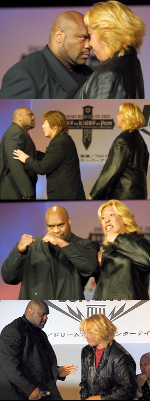 サップ×高山効果? 他の選手達も激しいパフォーマンス合戦 ▼ (12/31 up) 29日の会見はサップと高山に限らず、他の試合の選手達のやりとりもなかなか面白いものがあった。“狂犬”ヴァリッジ・イズマイウと前田日明の弟子・滑川康仁がにらみ合いを繰り広げ、ゲーリー・グッドリッジはマイク・ベルナルドに「君はゴングが鳴った瞬間にダウンする。起きたら2003年になっている」とジョークで挑発。藤田和之が「すべてを完結して相手の存在を消す」と意気込めば、ミルコは顔から笑みが消え「あまり言うことはない。また勝つために来た」と言い放つ。“サップ×高山効果”とでも言うべきか? 各選手の言動にエンターテイメントとしての広がりが感じられ、大みそかの祭りに向けての良いムードが醸し出されていた。この状況にはアントニオ猪木プロデューサーも「今日はみんなスッキリとしたいい顔をしている」と上機嫌。町中での宣伝活動でも盛り上がりを実感しているといい、「NHKと五分五分ぐらいで行きたい」と大会の成功に自信をのぞかせた。