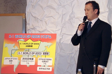 ▼ (2/14 up) 今年のK-1ワールドグランプリのシステムが、3.30さいたま大会のカードとともに、14日の記者会見で発表された。 石井和義・前プロデューサーが法人税法違反の容疑で3日に逮捕されて以降、初めてのK-1の記者会見。冒頭、角田信朗・競技統括プロデューサーは「一連の事態で皆様に多大なるご迷惑とご心配をおかけしたことは非常に遺憾であり残念に思っております。我々はK-1という世界最高峰のスポーツソフトをなんとしても守り継続していかないといけない責任と使命を感じています。10年という区切りに、今までのシステム・体制をリセットして、新体制にリニューアルしてK-1を死守する覚悟を決めた次第です。一大会一大会が真剣勝負になると思います」と決意を示した。ただしリニューアルは内部の運営面に関しての話で、外面的な大会日程や選手の選抜システムは大筋において変更はない。 今年のワールドGPシリーズは、「地区予選」「地域予選」「本戦」の3段階に分けられる(日程は下記)。「地区予選」は6ヶ所で行われ、無名の選手や新鋭の発掘が目的だ。優勝者は「地域予選」に進出し、日本でも馴染み深いイグナショフ、アビディ、ボンヤスキー、ブレギーといった、いわば本戦一歩手前の選手たちとしのぎを削る。地域は4つに分かれ、敗者復活戦も8月中旬にラスベガスでも予定されている。「本戦」は10.11大阪ドームで開幕し、4地域の優勝者、敗者復活選手、推薦選手の計7人が、昨年度ベスト8ファイター7人(武蔵以外)とワンマッチで激突。その勝者7人と9月のジャパンGP覇者1人が、12.6東京ドームで世界の頂点を目指す。 「地域予選」ではスーパーファイトも1、2試合ずつ組まれ、5.2ラスベガスではサップが母国デビューを果たす予定だ。5.31スイスではベルナルドやレコ、6.14パリではバンナ、7.27メルボルンではハントやセフォーがワンマッチを行う模様。 他にも日本国内ではワールドGPシリーズのワンマッチ大会が2回行われる。3.30さいたまがその一つで、7.13マリンメッセ福岡も決定。ジャパンGPシリーズとワールドMAXシリーズも去年同様並行して行われる。 なお、谷川貞治イベントプロデューサー(写真)は、各地区・地域の事情により、弱冠の日程変更があるかもしれないとも語っている。(井原芳徳)