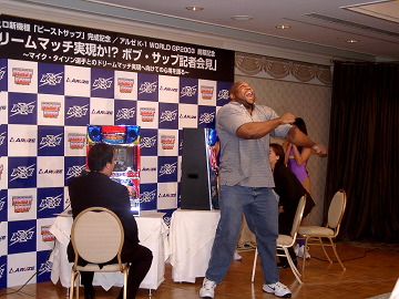 ▼ (9/2 up) K-1事務局とスポンサーのアルゼは1日都内で合同記者会見を行い、ボブ・サップがマイク・タイソン戦実現に向けての心境を語り、アルゼ製造のパチスロ新機種「ビーストサップ」のお披露目も行われた(写真:谷川貞治・K-1イベントプロデューサーとのパチスロ対決に勝ち、ビーストダンスを披露するサップ) K-1はロサンゼルスで現地時間の8月22日、マイク・タイソンと米国内でのプロボクシング公式試合を除く試合のプロモート権・マネージメント権の契約を結んだ。今後は具体的な試合日程について両者で話し合いが行われる。谷川Pによると国内での対戦にはこだわらず、年内に行う場合は会場の確保が難しいため海外、来年に行う場合は国立競技場クラスの大会場での開催となる見通しを示した。 サップはタイソンを「子どもの頃から知っていた、尊敬するファイター」と評しながらも、「洗練されたK-1のリングに上がってきたときには、リングから下りて欲しいと思った」と腹を立てたという。タイソンはボクシングルールを希望しているようだが、サップはK-1、キック、総合格闘技のいずれかでの対戦を熱望。「今まで見せた事はないが、ハイキックでKOしてやる」と息巻いた。タイソン戦を仮想してか、10月11日のK-1 WORLD GP開幕戦ではボクシングスタイルのジェロム・レ・バンナとの対戦を希望。谷川Pもこのカード実現に前向きな考えを示している。