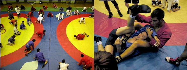▼ (9/24 up) 現役のロシアンサンビストを招いての、サンボテクニックセミナー。多数の受講者を得て、第一回目が開催されました。 2時間半余りにわたるセミナーは、始まりの挨拶から準備運動、そして練習内容まで、すべてロシア式で行われました。20分程のウォーミングアップ(下左写真)に続き、前半の寝技、後半の投げ技、それぞれ数本のスパーリングを交えながらみっちりした中身です。 主に講議を進めたのは、足関節技で世界選手権を制したライス選手。帯を持つ組み手からのひざ十字固めや、腕十字からひざ十字への連係など、スペシャリストならではのテクニックを披露しました。 参加者は、スポーツ会館を初めとする和製サンビストを始めとし、プロフェッショナルサンビスト軍団「SKアブソリュート」から、柔術などでも活躍する林俊介(下右写真で技をかけられている選手)、パンクラス参戦中の和田拓也、長谷川秀彦など。その他、プロ総合格闘技でも活躍する選手の姿も見受けられました。 このセミナーの1週間前に大阪で行われた藤井惠セミナー同様、総合格闘技界でもサンボテクニックに注目している選手は少なくないようです。 今回は、まったくサンボの経験がない受講者もいたため、ベーシックな技術も交えて行われましたが、9月28日のセミナー(詳細下記)は「リアルサンビスト」育成のための実践テクニックを中心に講議を行う予定です。(日本サンボ連盟:広報委員・吉澤)