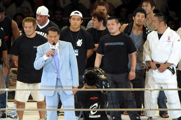 ▼ (8/11 up) PRIDEの新シリーズ「PRIDE 武士道(BUSHIDO)」の第1回大会の開催が正式に決定した。「武士道」は6月のPRIDE.26の前日の会見で榊原信行・DSE社長が構想を示していた大会で、日本人選手の層が厚い83kg以下(UFCミドル級相当)を軸に、ジム対抗戦や異種格闘技的な試合など、これまでのPRIDEにない実験色の濃いカードが組まれる模様だ。年内は10月5日大会のみで、来年は3大会が計画されている。 10日のPRIDE-GP開幕戦の休憩明けには、アントニオ猪木・PRIDEエグゼクティブプロデューサーの「我と思わん奴は今すぐこのリングに出てこい!」という呼び掛けの後、選手の名前が次々とアナウンスされ、花道から日本人選手が続々と登場。桜井“マッハ”速人を先頭に、三島★ド根性ノ助、大山峻護、滑川康仁、小路晃、中村和裕、高瀬大樹、岡見勇信、光岡映二、アングロサクソン大場がリングイン。外国人のマリオ・スペーヒー、マーク・コールマン、アスエリオ・シウバ、さらにはK-1ファイターのピーター・アーツまでもがリングに登るという、豪華な顔ぶれとなった。 そして猪木氏は「この中で一番のバカヤローは誰だ?お前だ!」と叫び、マッハにビンタ。PRIDEの“洗礼”を受けたマッハは「ありがとうございます。桜は散ります。そしてまた咲きます。マッハ桜はマッハの勢いでまた咲き始めました。桜庭さん、頑張ってください」と挨拶した。 大会後の榊原社長によると、あくまでこれらの選手は「今後PRIDEに上がる気持ちのある選手」で、この中から何人かが10月5日大会に上がる模様だ。この日メインでヴァンダレイ・シウバに三連敗を喫した桜庭和志についても、榊原社長は「武士道」で復活させる構想があることも語った。