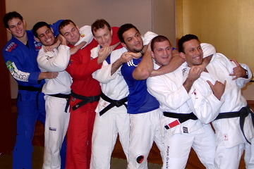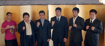 ▼ (10/2 up) 2日都内で、対抗戦に出陣するグレイシー一族の決起集会が行われた。ホイス監督のみ3日に来日。大将のハイアンは浜中和宏戦そっちのけで、「吉田秀彦をボコボコにしたいね。ホイス戦はレフェリーをダマした勝ち方で、あれは男のやることじゃないよ。吉田は柔道の素晴らしいメダリストなんだから、あんな手を使う必要はないはずだ。本当ならニュートンの代わりに吉田が出て、ヘンゾと戦うべきだ」と怒りをあらわにしていた。 なお、PRIDE武士道では通常の試合と違い3R目が無く、1R10分+2R5分の2R制で試合が行われることも発表された。光岡×ブレナン等、始め3試合行われる「武士道挑戦試合」は5分2R制が採用される。試合順はページ末尾のカード一覧参照。(井原芳徳) (写真:前からヘンゾ、ハウフ、ハイアン、ヒリオン、ホドリゴ、ダニエル、ホジャー。ヒリオンとホジャーはスパーリングパートナーとして同行。さすがにこれだけ揃うと、モーニング娘の全メンバーを言い当てるより難しい?)