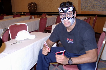 ▼ (10/3 up) ドス・カラスJr.が、目の周りを大きくカットした特別仕様のマスクでミルコ・クロコップ戦に挑むことが明らかになった。ミルコのハイキックを警戒するドスJr.は、視界が遮られてキックが見えないことを理由に、命の次に大事なマスクを脱いでまで試合に臨む決心をしていた。だがマネージャー的立場にある佐伯繁DEEP代表が、マスクを脱がないように説得。ドスJr.は試しに持参したマスクの1つの目の周りをハサミで切り抜いてみたところ、キックが見えるようになったことが確認でき、マスクを付けて戦うことを決めた。なおミルコはまだ来日していないが、代理人によるとドスJr.のマスク着用に特に不満は無いとのこと。ちなみにドスJr.は、これまでメキシコのプロレス団体「AAA」所属を名乗っていたが、今回は総合格闘技の修業先である「ファス・バーリトゥード・システム」所属として出場する。(井原芳徳)