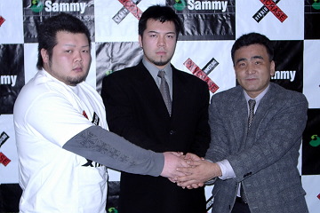 ▼ (3/18 up) 元極真会館の野地竜太がパンクラスMEGATONに入団し、18日ピーズラボ東京で記者会見を行った。(写真:左からMEGATONリーダーの高森啓吾、野地、尾崎允実・パンクラス社長) 野地は東京都出身・1978年10月6日生まれの25歳。15歳で極真空手を始め、99年には世界大会に出場し、弱冠20歳ながら7位入賞を果たす。00年11月には全日本キックでキックデビューを果たし1R KO勝ち。以降は一撃やK-1 JAPANにも出場。敗れはしたものの武蔵、中迫剛、ユルゲン・クルト相手に判定に持ち込んでいる。日本人の若手の重量級ストライカーの中でも、特に将来が期待されていた選手だけに、パンクラスが獲得に成功したことの意義は大きい。近藤有己と並ぶ看板選手として今後のパンクラスの戦力の要となるだろう。 昨年4月に極真会館を離れたが、今月初頭に尾崎社長とともに松井章圭・極真会館館長と会談。今後パンクラスで活動していくことを伝えると、松井館長は「がんばれよ」と激励したという。野地は「10年間の空手で身に付けた技術を活かし、松井館長にも喜んでもらいたい」と語る。 昨年7月に両足首を手術し、しばらく静養していたが、知人を介してオーバー100kgの重量級集団・MEGATONと出会い、入団を決意。既に2月から総合格闘技の練習を始めている。野地の格闘技キャリアは極真空手とキックボクシングだけで、寝技は未経験。練習内容はまだ「基礎の基礎のレベル」だといい、「スタミナ配分も使う筋肉も違う。打撃も寝技を警戒してのものになるので違ってくる」と戸惑いは隠せない。理想の戦い方について聞くと「ミルコやシウバのような戦い方が参考になる。なるべく立った状態で相手を殴って蹴って倒していきたい」と語った。 尾崎社長はMEGATONのトレーナーとも相談し、2、3ヶ月後にパンクラスマットデビューをさせたい考え。だが野地の足はサンドバッグなら蹴れるが「まだ人を思いっきり蹴っていない」回復段階。無差別級かスーパーヘビー級での活躍が見込まれ、将来的には無差別級王者ジョシュ・バーネットとの対戦も期待されるが、本人は「今のところ誰と戦いたいといった目標はない。とりあえず1試合1試合をやっていけば先が見えて来る」と慎重で、じっくりと寝技を身に付け、パンクラスで活躍していきたい考えのようだ。 野地は総合だけでなくキックボクシングも並行していく意向。パンクラスマットでは鈴木みのる vs. モーリス・スミスのようにキックルールの試合が行われたこともあるため、尾崎社長はパンクラスでのキック戦も「ありえます」と語った。(井原芳徳)