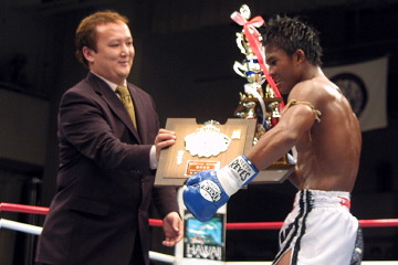 ▼ (3/22 up) MAX世界一決定戦開幕戦に出場するタイ人を決める一戦が21日の新日本キック後楽園ホール大会で行われ、“猪木事務所推薦選手”ブアカーオ・ポープラムックがフジ・チャルムサックを判定2-0で下し、MAX出場権を獲得した。ジャッジは新日本キックの審判団が務めた。 谷川貞治K-1イベントプロデューサー、ボブ・サップらK-1関係者がリングサイド席で見守る中、両者はトップレベルのタイ人同士らしくテクニカルでパワフルな攻防を展開。ブアカーオはオムノイスタジアムのライト級(61.2kg)の王者のため、MAXの-70kg契約では体格負けするのではと心配されたが、普段は70kg近くあるとのことで、3Rルールならスタミナ面も問題無し。チャルムサックに全く力負けせず、2R後半から右ミドル、ハイ等で押し気味に試合を運び、僅差ながらも勝利をもぎ取った。 試合後の谷川プロデューサーは激闘に興奮した様子で、「本物が現れました。優勝候補ですね。魔裟斗は勝てるんだろうか…」とブアカーオの身体能力の高さに驚きを隠せず。サップも「グレイトファイト。いいテクニックを見れて良かったよ」と満足げだった。24日には世界一決定戦のカードが発表される予定だ。(井原芳徳)