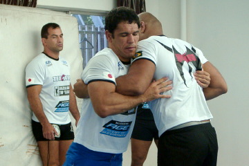 ▼ (4/19 up) アントニオ・ホドリゴ・ノゲイラが19日、新宿某所で練習を公開した。内容は寝技のみ。師匠のマリオ・スペーヒーの指導の元、猪木アリ状態で立った側からサイドポジションに回り込み、ニーオンザベリーでパンチを叩き込む動きと、ガードポジションからの腕十字の色んなパターンを再チェックした。最後はスタンドのレスリングからスパーリングパートナーをテイクダウンし、実戦に近い流れで腕十字を極めてみせた。 ステファン・レコ同様、時差ボケ対策で早めの来日をしたノゲイラ。朝は早起きしてランニングをし、午後から本格的なトレーニングに入る。公開練習は軽めの内容だったが、「この2日間、ハードなトレーニングをしている」といい、表情はイキイキ。体調は万全のようだ。 残念ながら打撃は披露してくれなかったが、2月にはブラジルのボクシング五輪代表選手らとともにキューバで合宿し、パンチに磨きをかけた。GPで特に興味のある選手は、一度敗れた事のあるエメリヤーエンコ・ヒョードルと、柔道出身の小川直也だという。彼らと戦うためにも、横井宏考戦は難無くクリアしておきたいところだ。(井原芳徳)